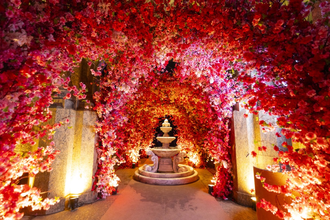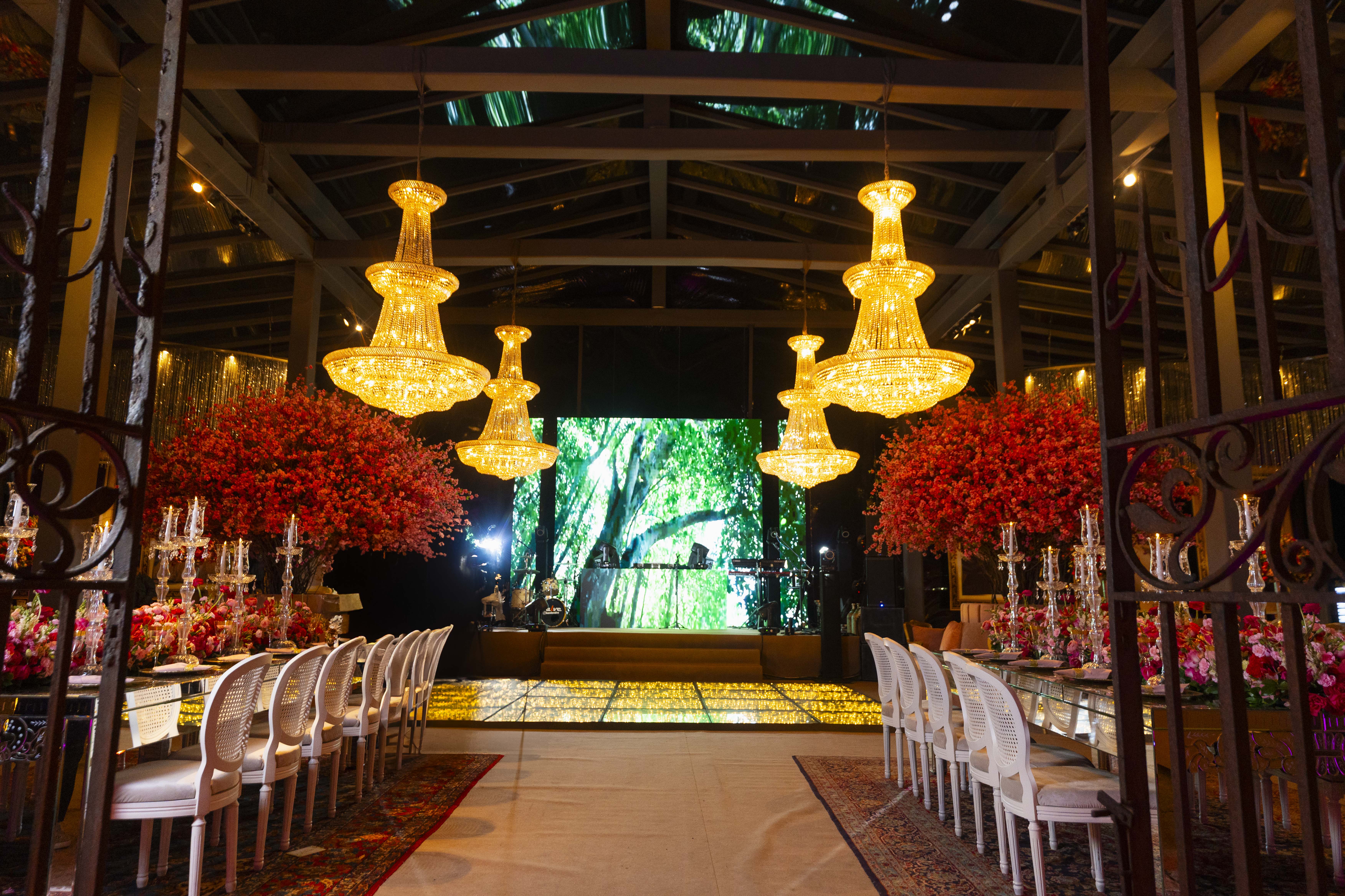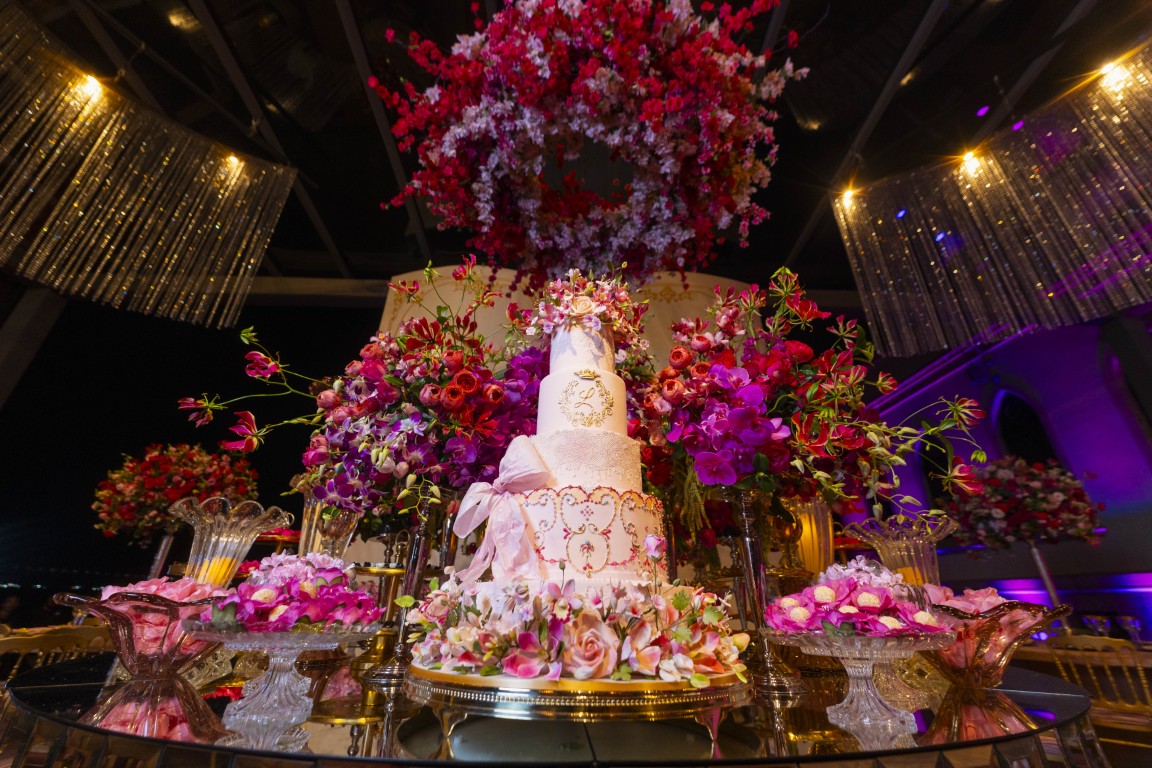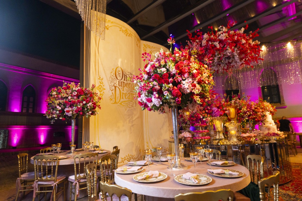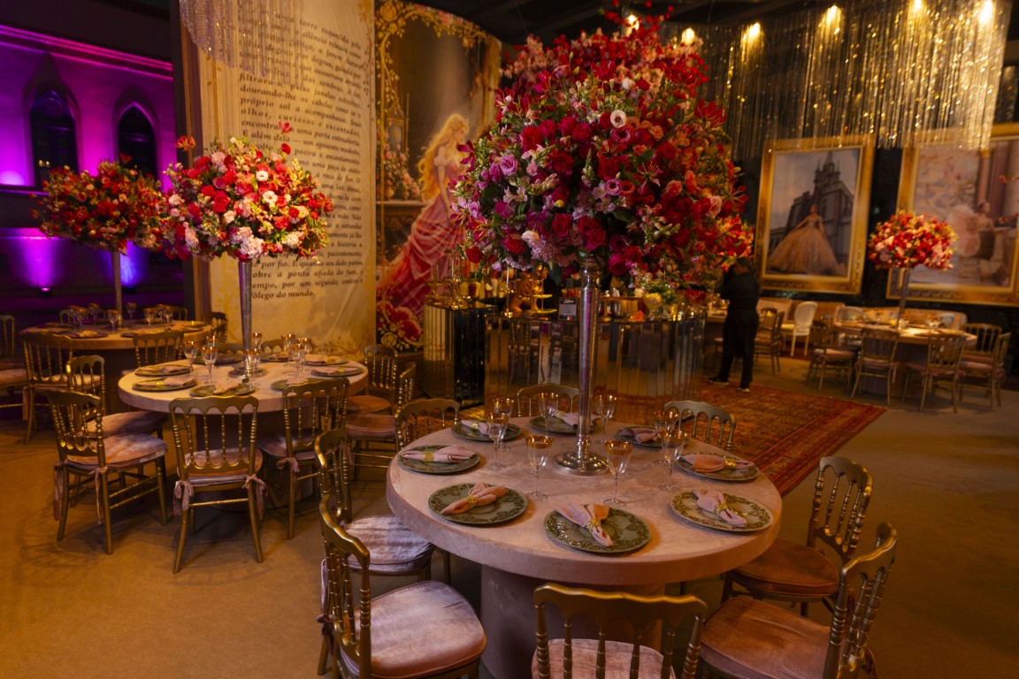 A paleta de cores passeou entre tons de rosa e fúcsia, equilibrados com dourado e luz quente. Os arranjos florais da Florarte reforçaram a sensação de jardim encantado, enquanto mesas espelhadas da Lona Cristal Eventos, lounges estofados e detalhes em veludo ajudaram a construir o clima palaciano.