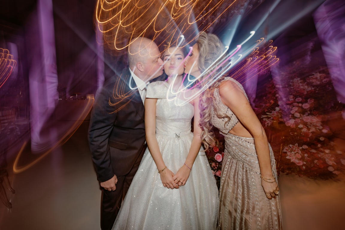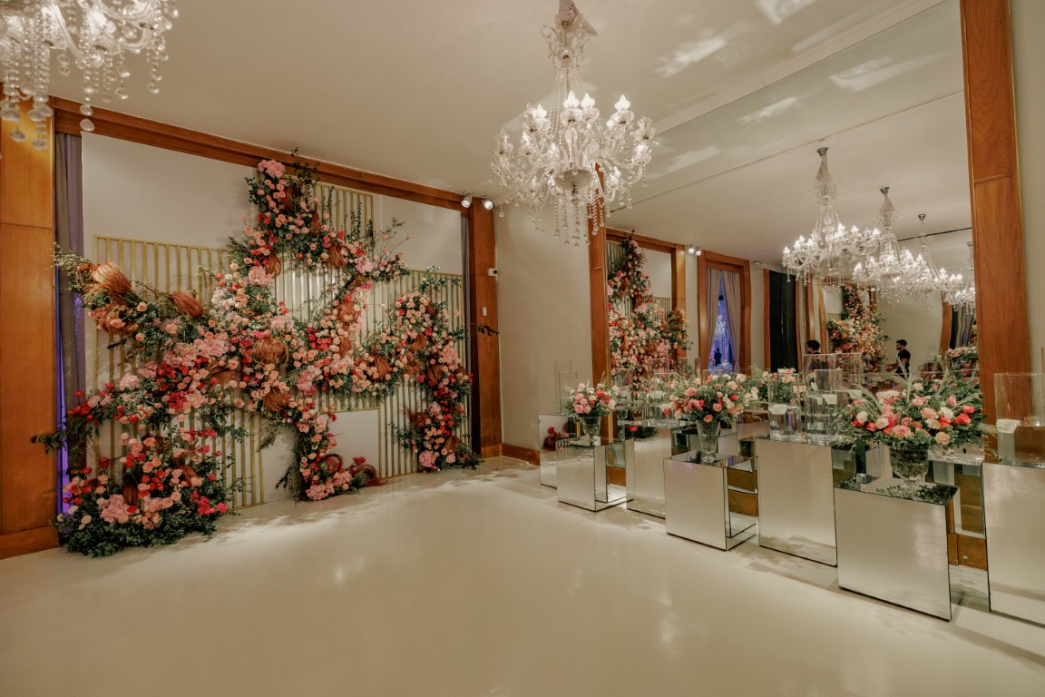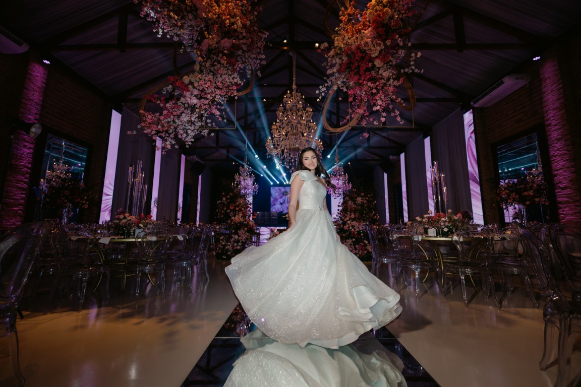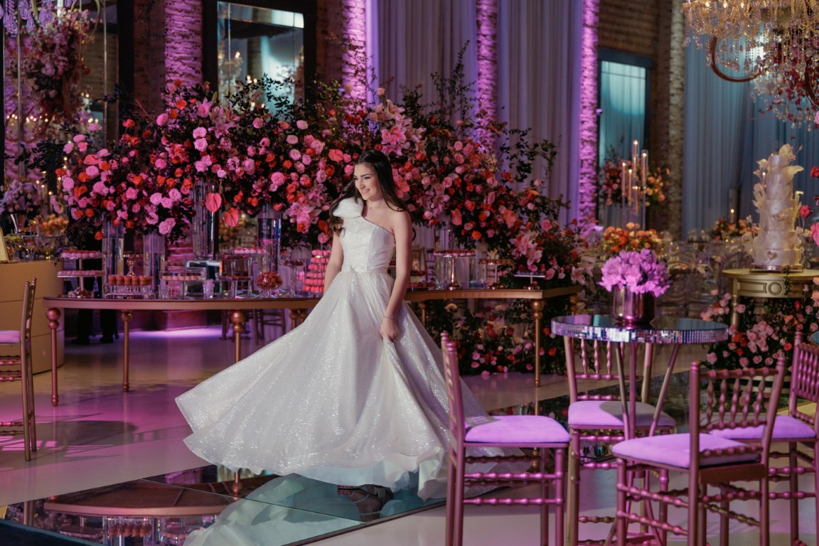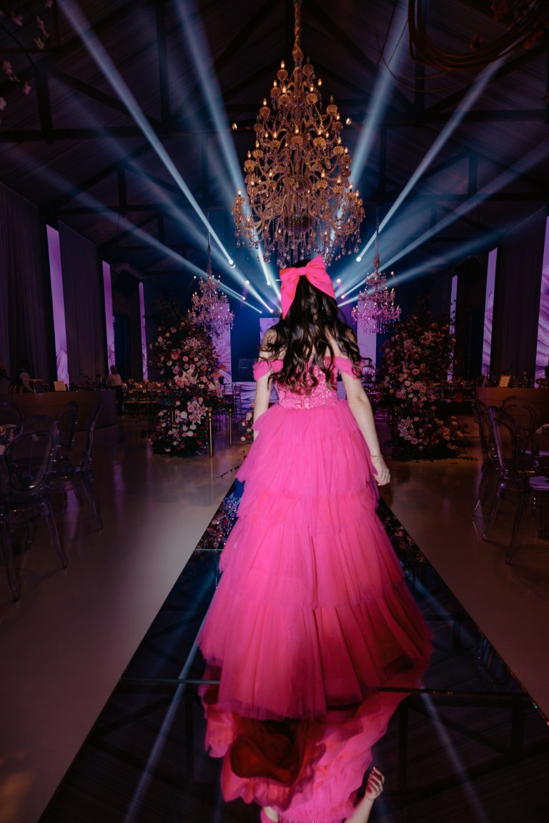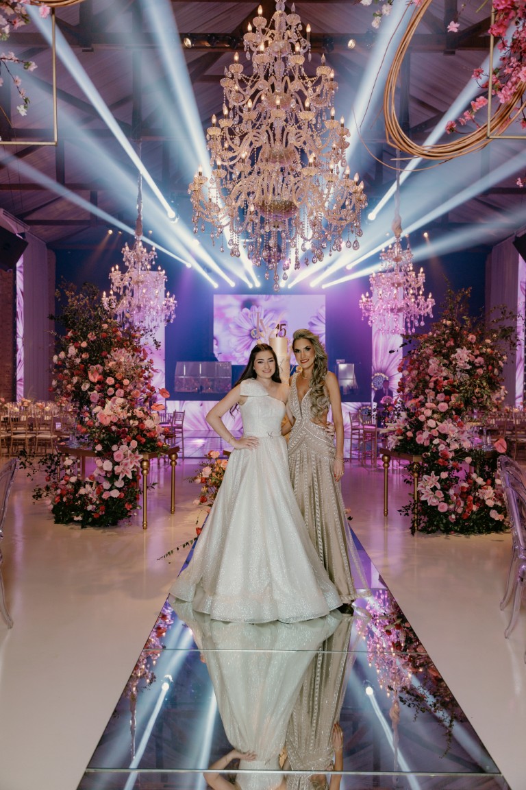 Entre os arranjos volumosos, os lustres de cristal e as velas estrategicamente posicionadas, o clima se tornou intimista e elegante. Além disso, a paleta em tons de rosa reforçou a delicadeza da ocasião, enquanto a pista de dança e os móveis da ME Movelaria trouxeram o toque moderninho que fez toda a diferença. Por fim, a decoração aérea imponente, e a passarela espelhada, completaram o cenário, refletindo o brilho e a emoção de uma noite inesquecível.