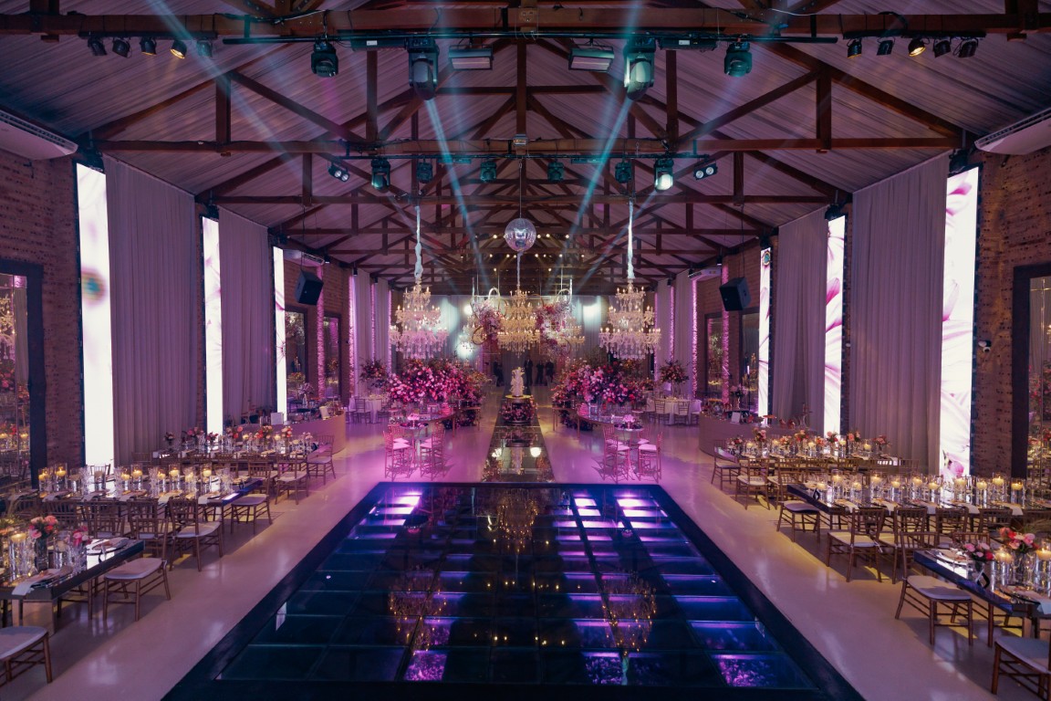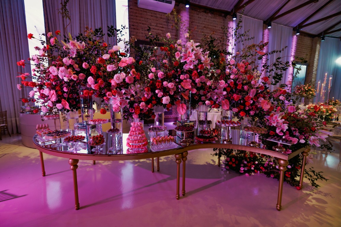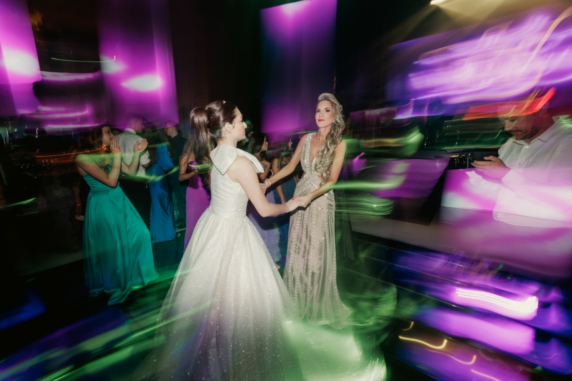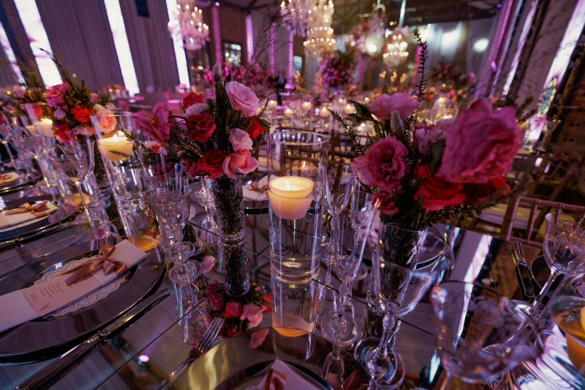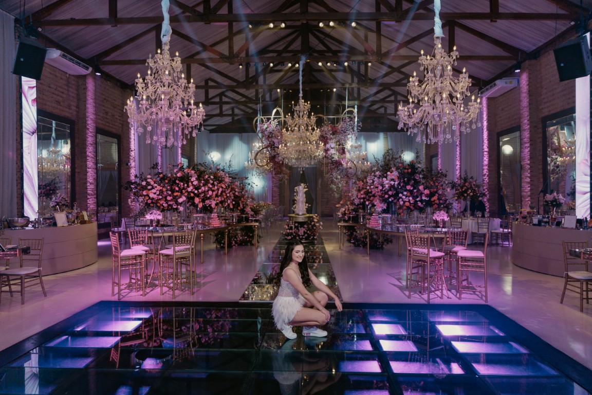Entre os arranjos volumosos, os lustres de cristal e as velas estrategicamente posicionadas, o clima se tornou intimista e elegante. Além disso, a paleta em tons de rosa reforçou a delicadeza da ocasião, enquanto a pista de dança e os móveis da ME Movelaria trouxeram o toque moderninho que fez toda a diferença. Por fim, a decoração aérea imponente, e a passarela espelhada, completaram o cenário, refletindo o brilho e a emoção de uma noite inesquecível.