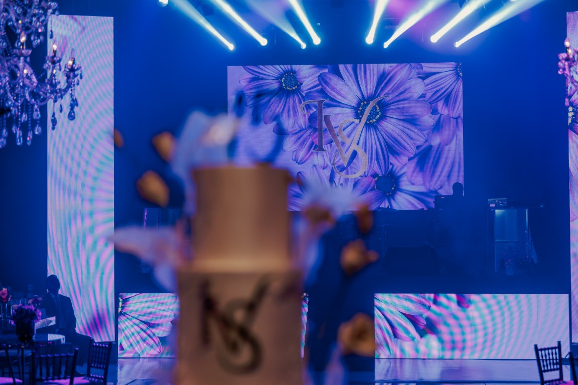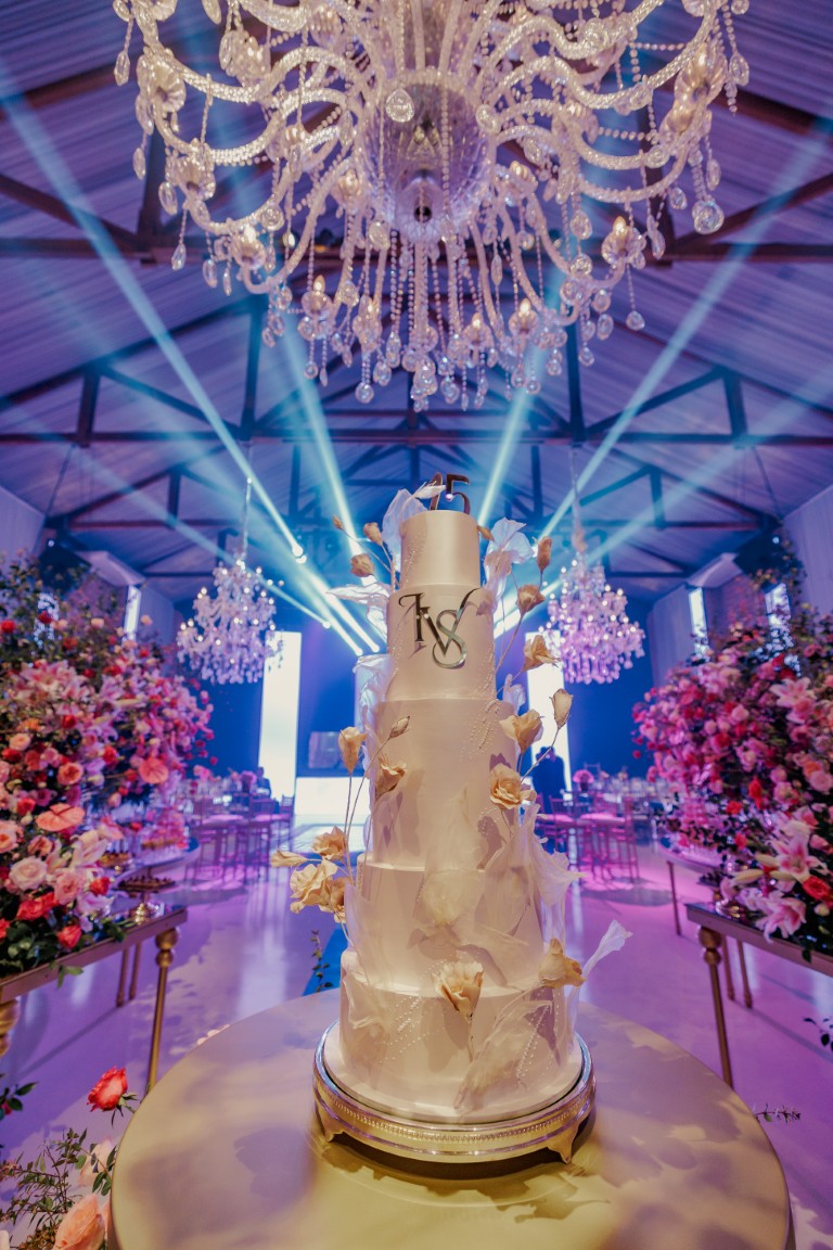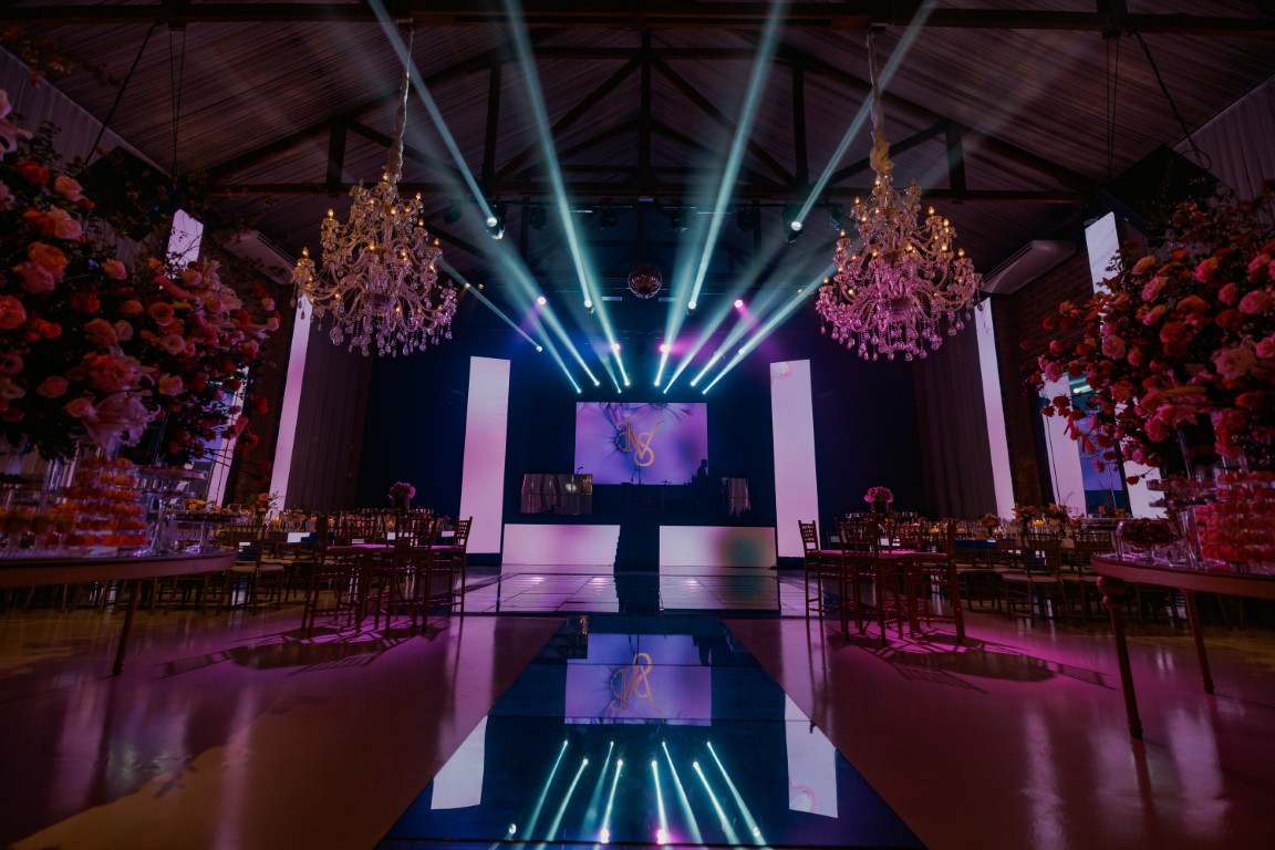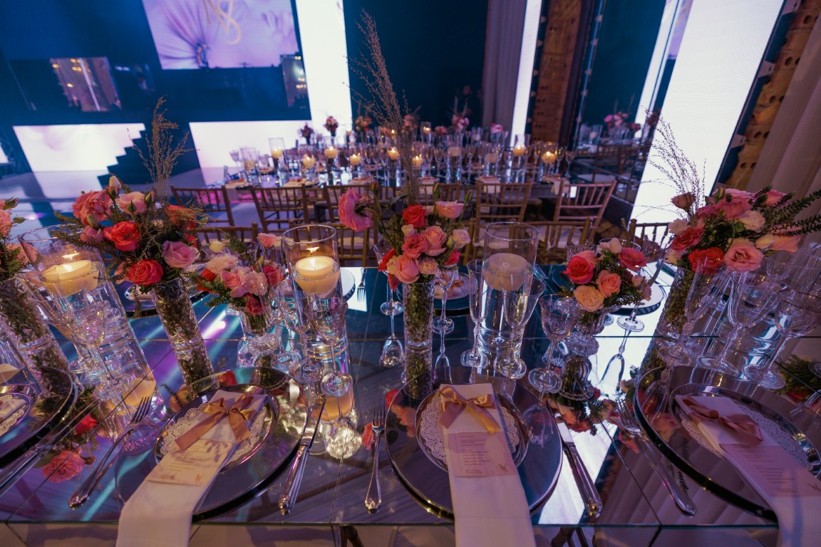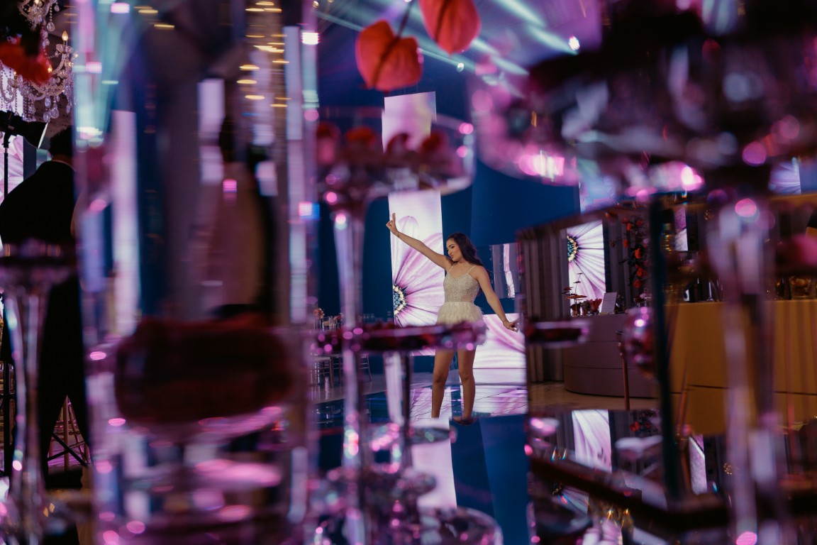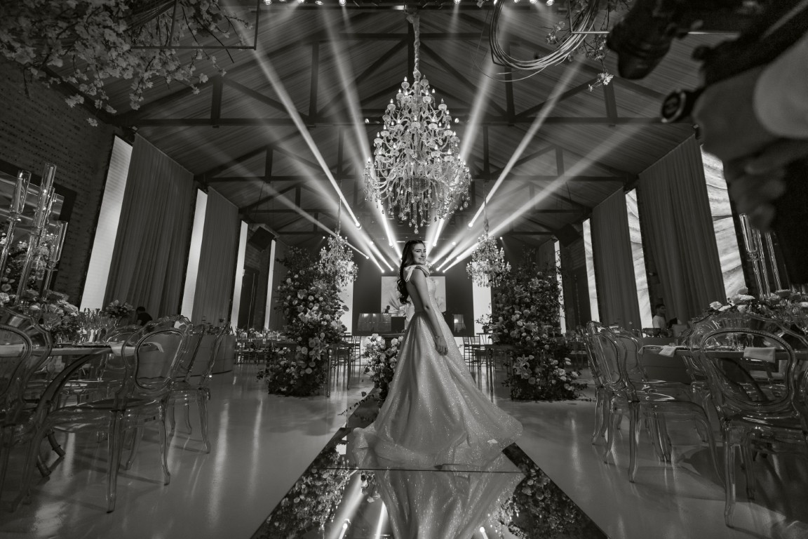 Entre os arranjos volumosos, os lustres de cristal e as velas estrategicamente posicionadas, o clima se tornou intimista e elegante. Além disso, a paleta em tons de rosa reforçou a delicadeza da ocasião, enquanto a pista de dança e os móveis da ME Movelaria trouxeram o toque moderninho que fez toda a diferença. Por fim, a decoração aérea imponente, e a passarela espelhada, completaram o cenário, refletindo o brilho e a emoção de uma noite inesquecível.