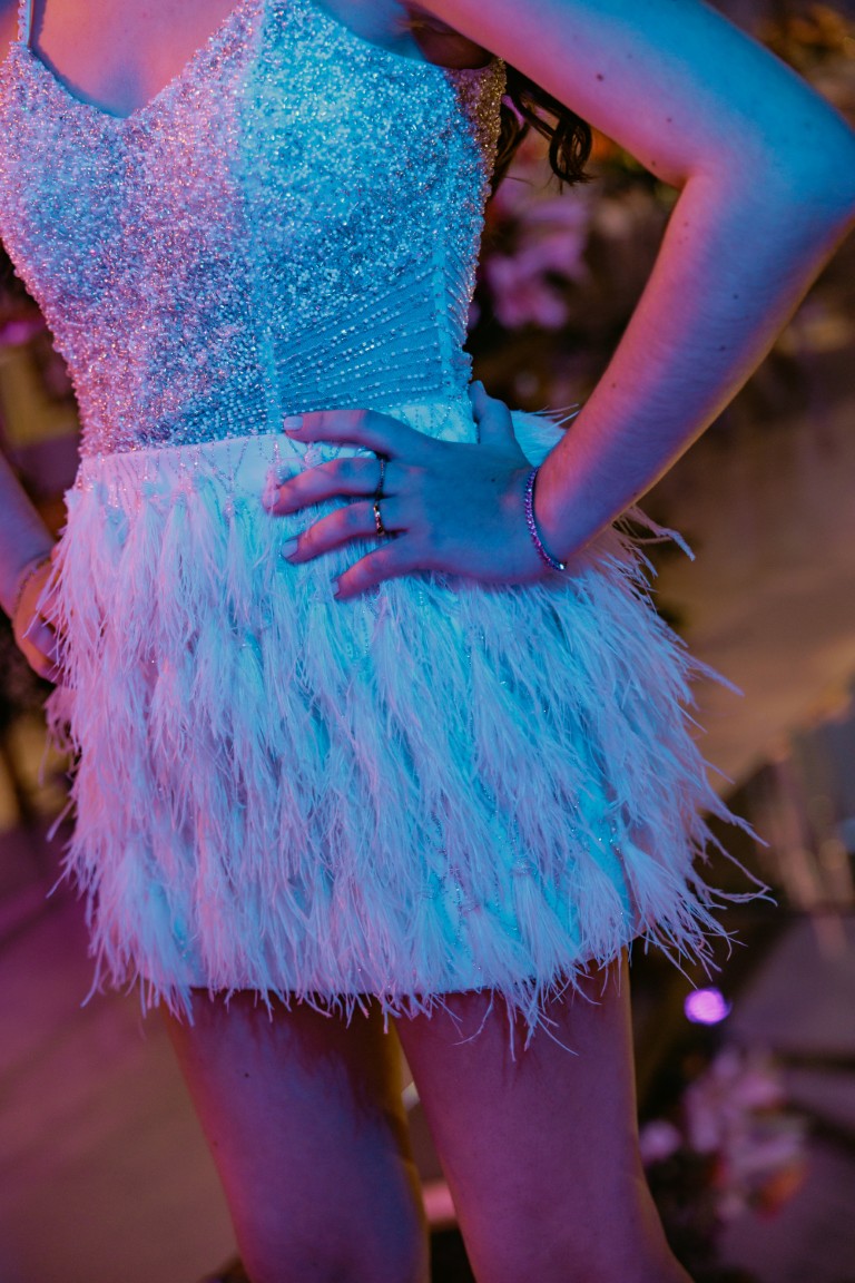 Logo na recepção dos convidados, Ianne apostou em um vestido longo, porém curto na frente, com saia em tule pink e corpete bordado, unindo leveza, movimento e um toque fashionista. Já para a valsa, ela brilhou em um clássico vestido branco, de um ombro só, com laço marcante e muito brilho, esbanjando elegância. Por fim, na hora da balada, surgiu com um vestido curto branco, de saia de plumas e corpete de pedrarias, perfeito para acompanhar o ritmo e o brilho da pista.