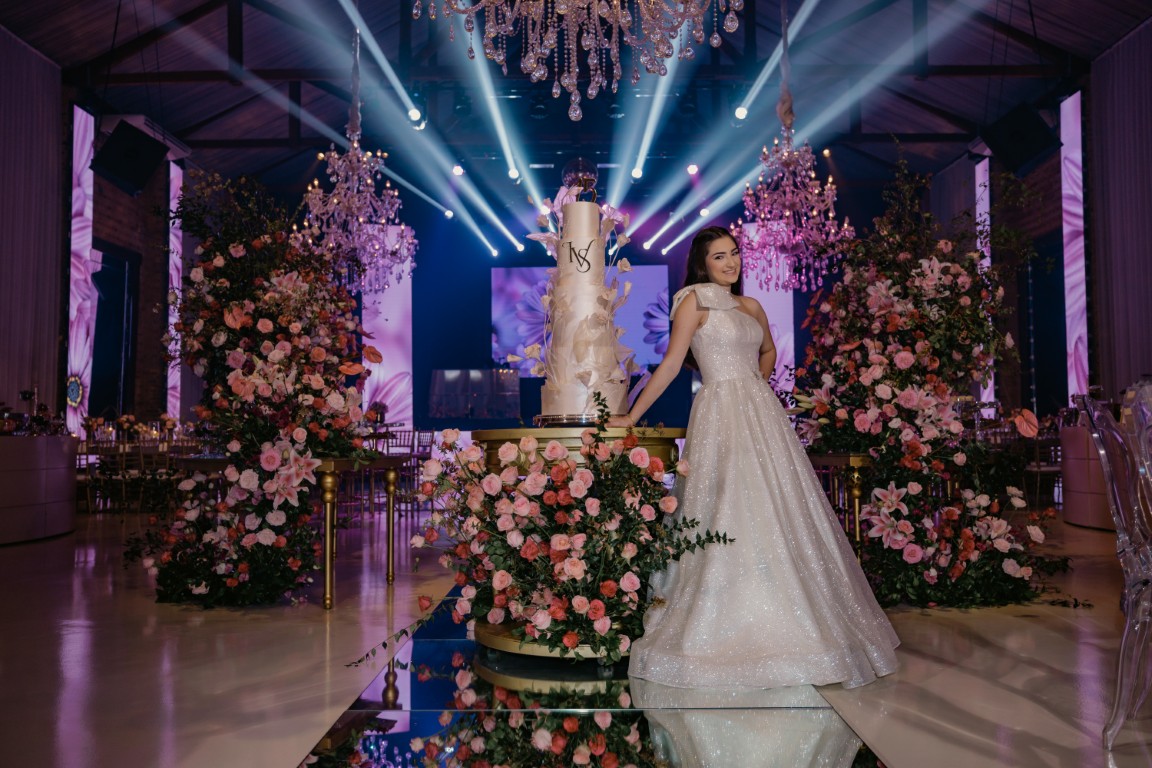 Entre os arranjos volumosos, os lustres de cristal e as velas estrategicamente posicionadas, o clima se tornou intimista e elegante. Além disso, a paleta em tons de rosa reforçou a delicadeza da ocasião, enquanto a pista de dança e os móveis da ME Movelaria trouxeram o toque moderninho que fez toda a diferença. Por fim, a decoração aérea imponente, e a passarela espelhada, completaram o cenário, refletindo o brilho e a emoção de uma noite inesquecível.
