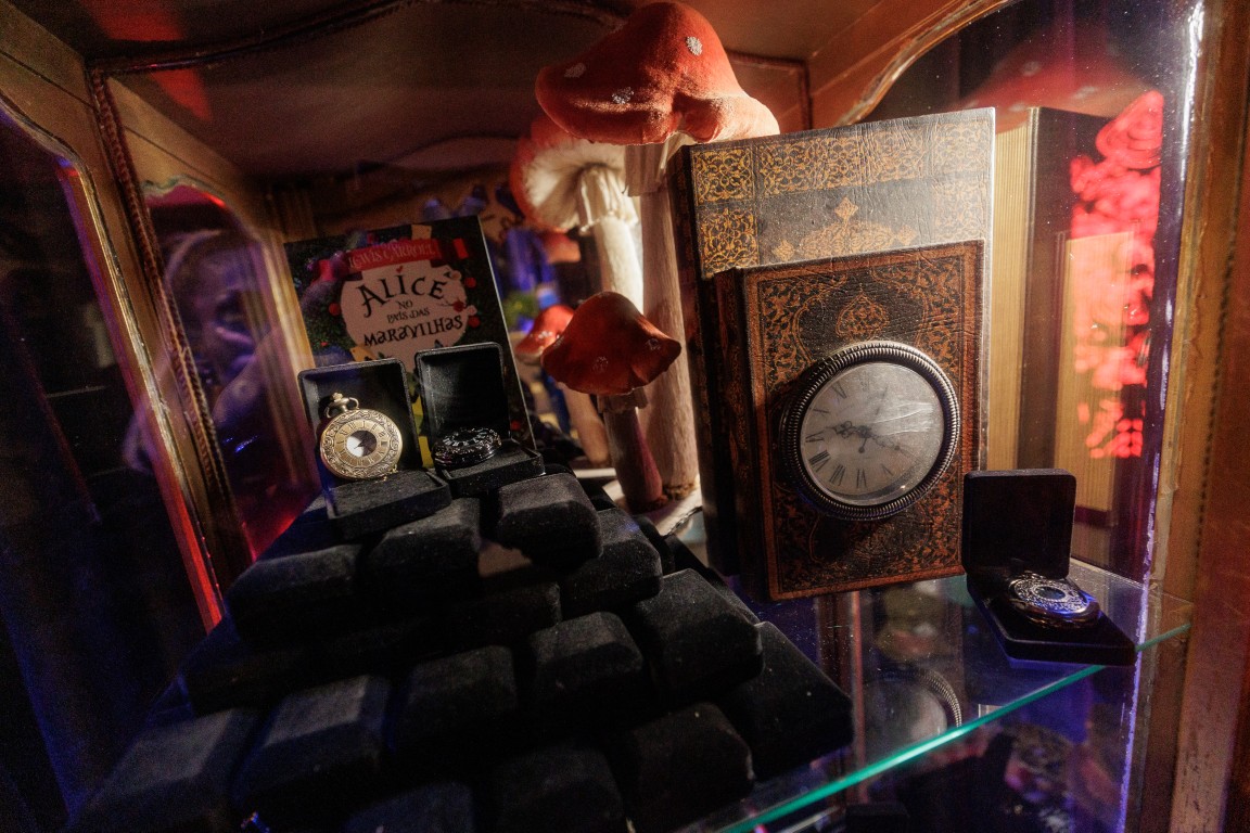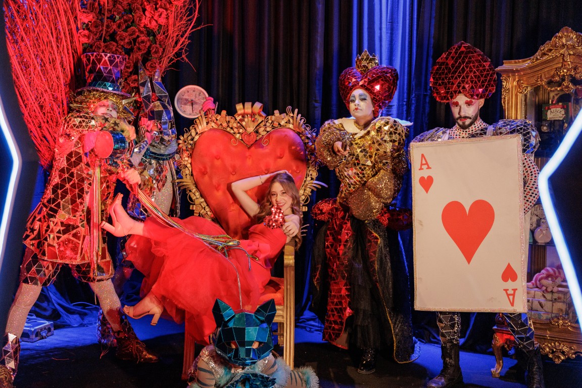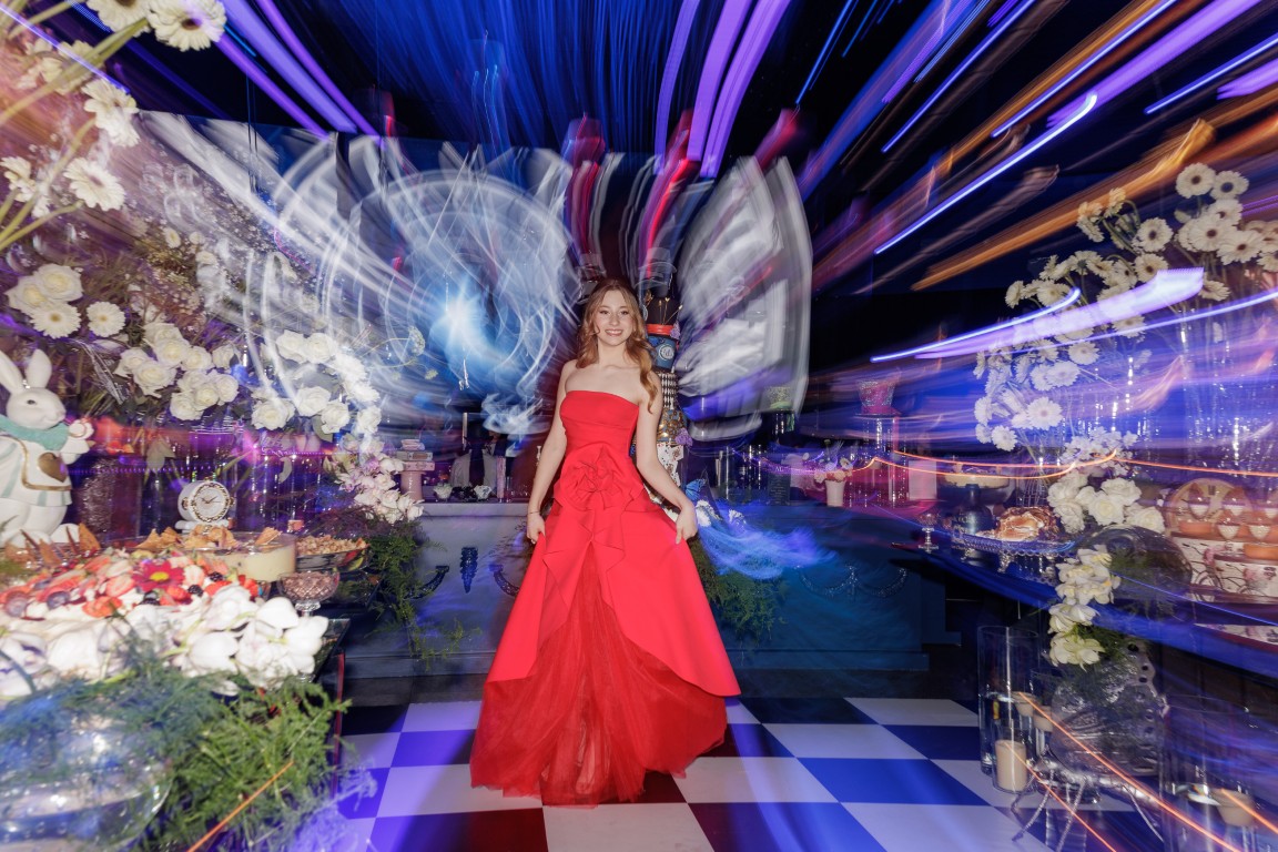 Personagens vivos do País das Maravilhas recepcionavam os convidados e circulavam pelo evento, intensificando a sensação de imersão e encantamento. No auge da noite, um vídeo lúdico mostrou a aniversariante surgindo como se ela própria se transformasse nos personagens do filme. Em seguida, o painel de LED subiu, revelando-a em um momento tão mágico que fez todos acreditarem, mesmo que por alguns instantes, que a magia pode ser real.