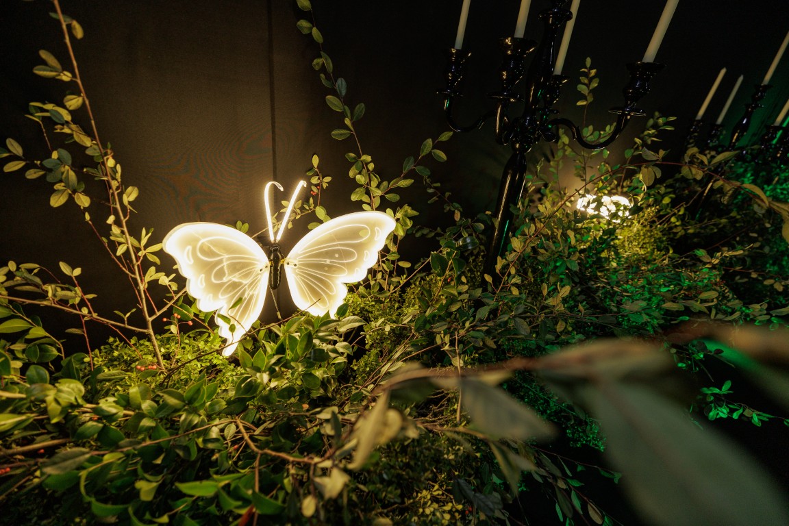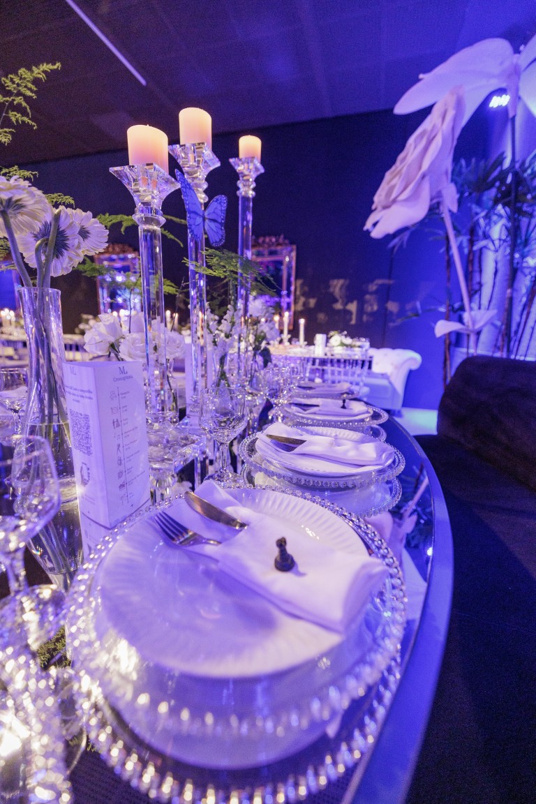 Flores gigantes se misturavam a arranjos exuberantes e delicados de Amarildo Flores, enquanto velas estrategicamente posicionadas criavam um clima mágico e acolhedor, em harmonia com o toque tecnológico e criativo da cenografia. No alto, uma decoração aérea imponente, com flores, cartolas e um lustre de LED, completava a imersão, como se cada elemento flutuasse dentro de um sonho.