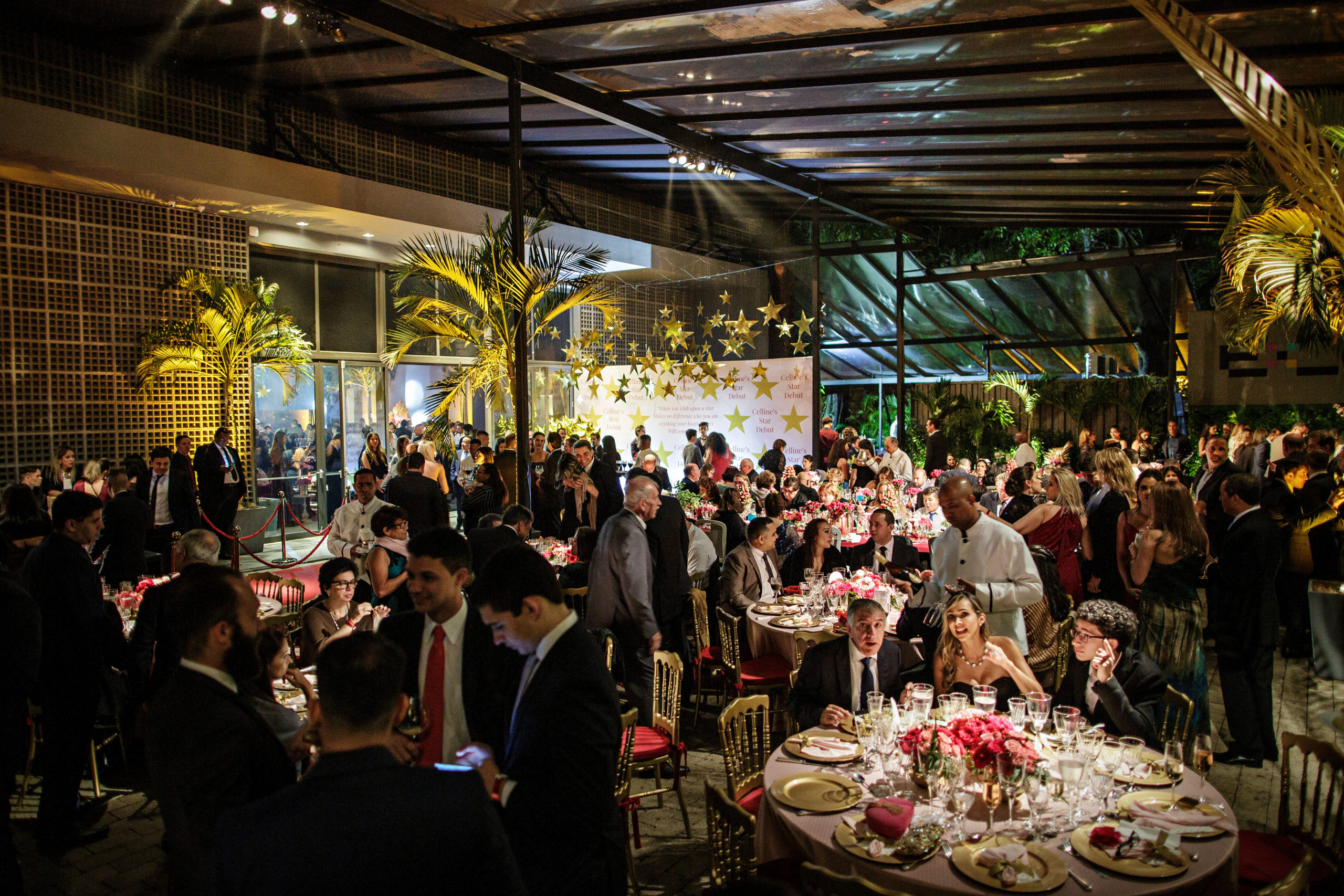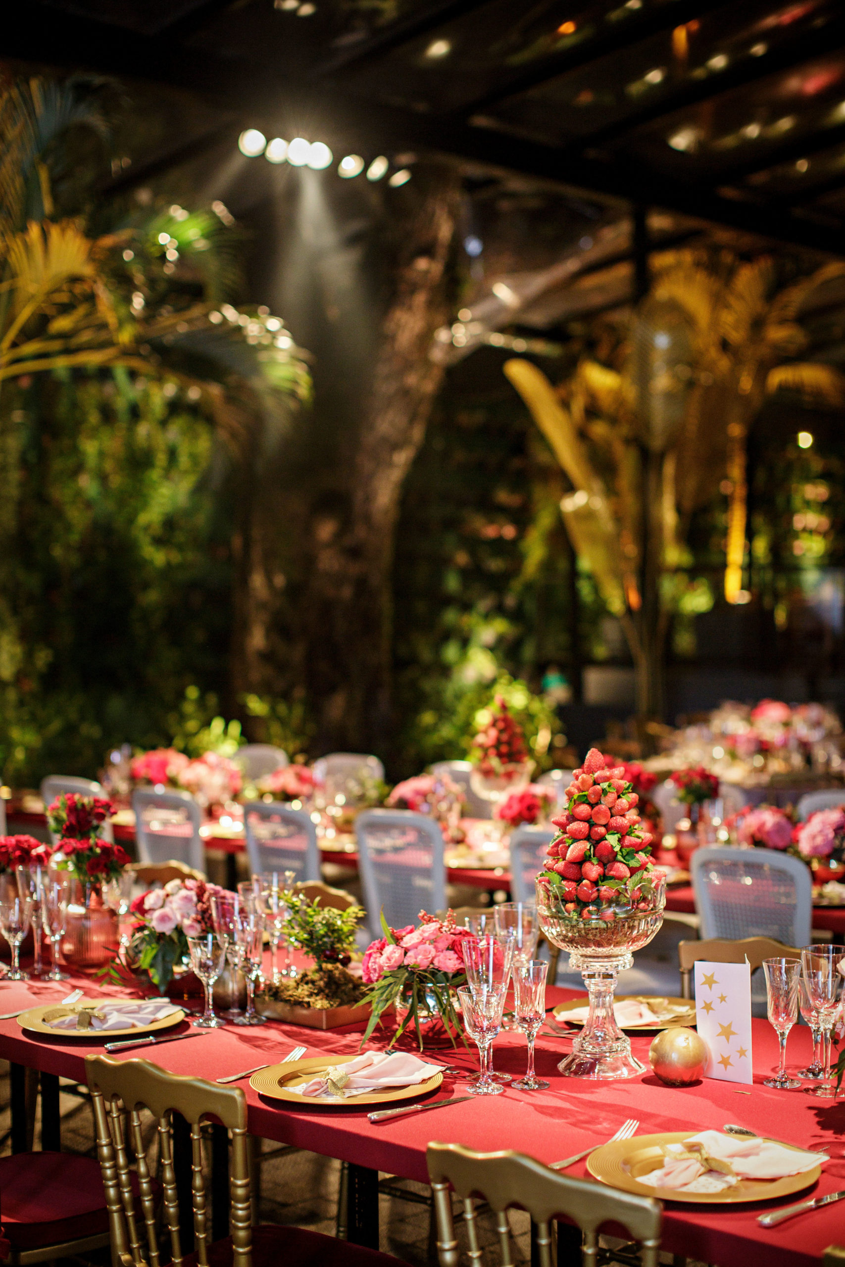 Combinando com a decoração, o mobiliário da Festah juntamente com as flores do Empório Santa Rosa foram responsáveis por tornar a noite ainda mais elegante. As cortinas da Lonarte e as toalhas da mesa de Ruth Dourado também encheram os olhos. Para compor com maestria e finalizar os detalhes com chave de outro, a Panos e Cores disponibilizou louças e sousplats dourados que foram um charme só!